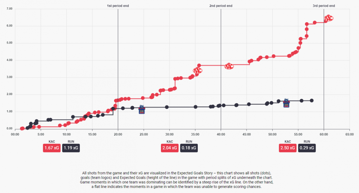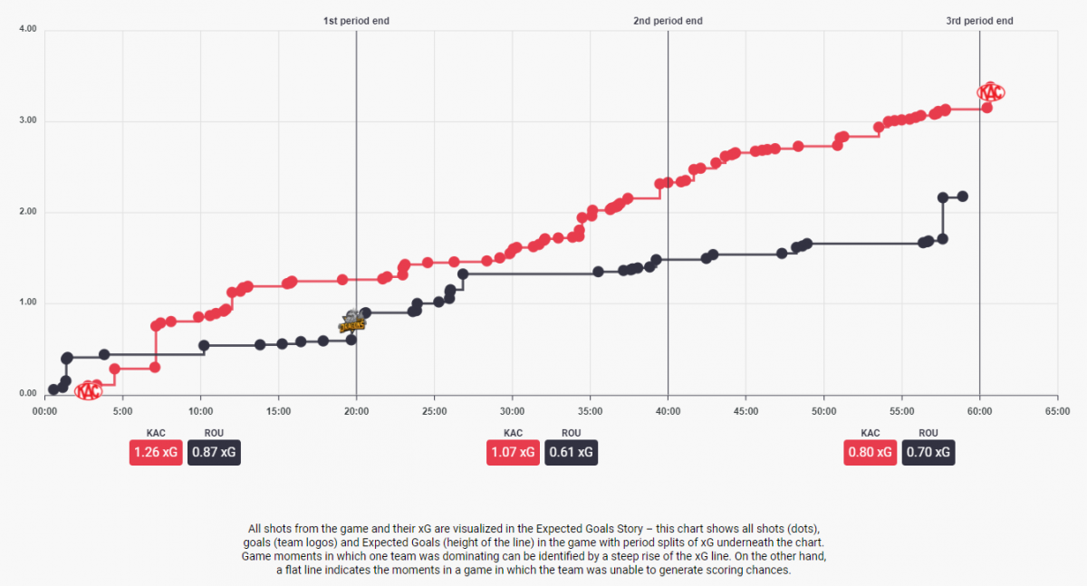 Sehr deutlich ersichtlich werden diese Spielverläufe auch in der von der CHL angebotenen optischen Darstellung der Expected Goals Stories. „Expected Goals“ (xG) basieren auf einem statistischen Berechnungsverfahren, das nicht nur die Anzahl der ungeblockten Schussversuche, sondern auch die Positionen am Spielfeld, aus denen sie abgegeben wurden, berücksichtigt. Im auf die Timeline des Spiels aufgetragenen xG-Modell der Champions Hockey League wird die rechnerisch zu erwartende Anzahl an erzielten Treffern aufgrund der Schussversuchsanzahl und -position kontinuierlich im Verlauf einer Begegnung ermittelt.