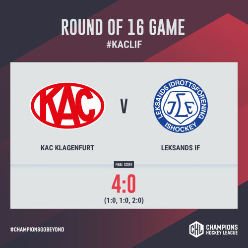 Nach dem 4:0-Erfolg im Hinspiel verfügt Klagenfurt über einen Vier-Tore-Polster für das Rückspiel. In der Champions Hockey League gibt es keine Auswärtstorregel, gewinnt Leksand am Dienstag mit vier Treffern Differenz, folgt eine zehnminütige Verlängerung („Drei-gegen-Drei“), der erste Treffer entscheidet das Duell. Fällt kein Overtime-Tor, folgt ein Penaltyschießen mit jeweils fünf Schützen, steht es auch danach unentschieden, wird das Shootout in Einzelrunden fortgesetzt. Jeder Sieg mit mehr als vier Treffern Unterschied bringt den Leksands IF in das Viertelfinale, bei jedem anderen Ergebnis als einer Niederlage mit vier oder mehr Gegentreffern steigt der EC-KAC auf. Der letztliche Sieger dieses Achtelfinalduells trifft in der nächsten Runde auf den Sieger der Konfrontationen zwischen CHL-Rekordsieger Frölunda Gothenburg und Adler Mannheim, die Schweden setzten sich im Hinspiel auswärts mit 10:1 durch.