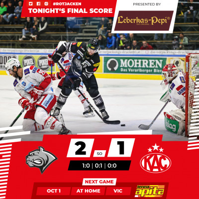 Im ersten und bislang einzigen Saisonduell zwischen den Dornbirn Bulldogs und dem EC-KAC setzten sich am 26. September auf eigenem Eis und im Penaltyschießen die Vorarlberger durch. Zuvor hatten Ņikita Jevpalovs spät im ersten Drittel (19.) für die DEC-Führung gesorgt und Nick Petersen (25.) früh im zweiten Abschnitt ausgeglichen. Die Rotjacken zeigten in dieser Begegnung, ausgetragen zwei Tage nach der deftigen 0:6-Pleite in Znojmo, eine durchwachsene Leistung, richtig stark agierten sie nur im Penalty Killing: In sechs Unterzahlsituationen, die sich über 8:50 Minuten erstreckten (3:10 davon sogar bei doppeltem numerischem Nachteil), kassierte man kein Gegentor. In der Offensive hatten die Klagenfurter an diesem Abend ihr Visier schlecht eingestellt: Aus 67 Torschussversuchen resultierten lediglich 28 Shots on Goal: 58,2 Prozent der Abschlüsse landeten auf DEC-Spielern (24 Blocks!) oder neben dem Kasten, in keinem anderen Saisonspiel war diese Fehlerquote beim EC-KAC bisher höher.