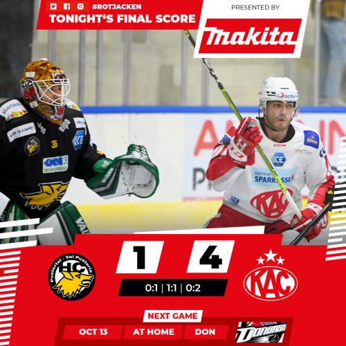 Der im Sommer neu in die bet-at-home ICE Hockey League gekommene HC Pustertal empfing den EC-KAC am 10. Oktober als insgesamt dritten Gast in seiner brandneuen und wunderschönen Heimspielstätte, der im Herbst neu eröffneten Intercable Arena. Die Rotjacken brachten dabei im ersten und dritten Spielabschnitt eine solide Auswärtsvorstellung aufs Eis, hatten im Mitteldrittel aber eine längere Schwächephase, in der sie ihre Spielstruktur verloren und durchaus im Glück waren, dass die Wölfe dies nur zu einem Treffer, dem zwischenzeitlichen Ausgleich zum 1:1, nutzen konnten. Überragender Akteur der Klagenfurter in dieser Begegnung war Johannes Bischofberger, der das Game Winning Goal ebenso erzielte wie den Empty Net-Treffer zum Endstand und zusätzlich auch noch zum Hundertpfund-Tor zum 3:1 assistierte. Für den Vorarlberger, der vor dem Auftritt in Brunico/Bruneck aus den ersten sieben Ligaspielen der Saison nur einen Scorerpunkt zu Buche stehen hatte, war die starke Vorstellung in dieser Partie die Initialzündung für eine seither ungebrochene Phase guter Form: In seinen elf Einsätzen in Bewerbsspielen (ICE und CHL) ab dieser Begegnung verbuchte der flinke Angreifer nicht weniger als 16 Zähler (acht Tore, acht Assists).