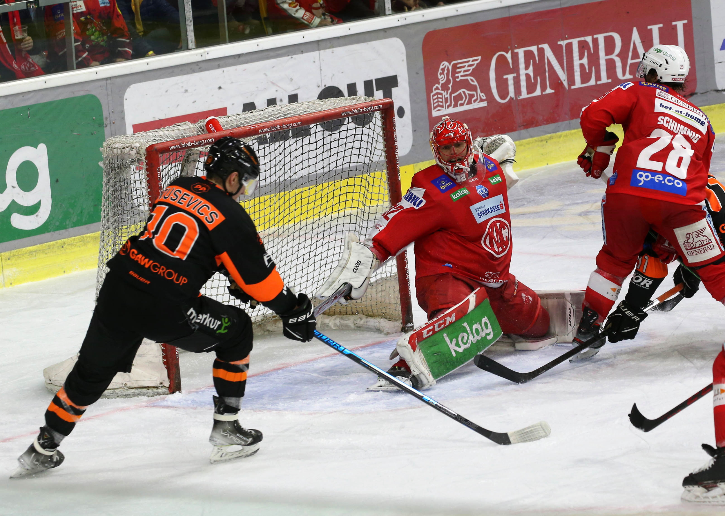 Unverändert bei doppeltem numerischem Vorteil agierend fehlte den Rotjacken der Nachdruck: Schüsse von Paul Postma von halbrechts (31./Blocker) und halblinks (32./Catcher) wurden zur Beute Engstrands. Als Clemens Unterweger den Puck aus der rechten Rundung an den ersten Pfosten chippte und Matt Fraser gut verlängerte, schlug die Scheibe nur auf der Schulter des Goalies ein (36.), ein aufgeknieter Hundertpfund-Onetimer aus der Mitte zischte hauchdünn an der Stange vorbei (37.). Davor hatte Steven Strong den finalen Querpass eines „Zwei-gegen-Eins“-Konters der Gäste gut abgefangen (36.), als Hjalmarsson seinen Landsmann Ackered ideal in Szene gesetzt hatte, blockte Manuel Geier (39.).