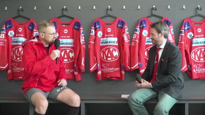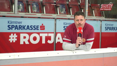 Die Mannschaft des EC-KAC absolvierte am Tag nach der klaren Auswärtsniederlage in Finalspiel zwei nur ein optionales Eistraining, der Großteil der Cracks arbeitete abseits des Spielfeldes. Das Magazin von #Rotjacken-TV hat den rot-weißen Montag dennoch begleitet: Nach einer kurzen Analyse der Auswärtsniederlage, aufgezeichnet in der Frühlingssonne vor der Heidi Horten Arena, kommt Assistant Coach David Fischer zu Wort, der über die Partie vom Sonntag und die nötigen Verbesserungen bis zum Dienstag spricht. Auch erinnert er sich an die Halbfinalserie 2017 zwischen Klagenfurt und Salzburg, in der er noch als Spieler miterlebt hat, wie die Rotjacken einen zwischenzeitlichen 0:2-Rückstand in einen 4:2-Erfolg verwandeln konnten. Joschi Peharz und Marc Brabant führen dann hinter die Kulissen des Magazins und stellen gemeinsam mit Filmemacher Patric Fohnen vor, wie eine Episode des Magazins entsteht und der Produktionsablauf aussieht. Es folgt eine Zuspielung aus der Halbfinalserie, als Puls24-Kommentator Martin Pfanner, der bekannt dafür ist, in Sendungen stets T-Shirts seiner Lieblingsband zu tragen, bei der Vorbesprechung einer Heimspielproduktion vorbeischaute und die #Rotjacken-TV-Gastgeber (passend zum „Rock’n’roll“-Playoff-Motto des EC-KAC) ebenfalls mit Motörhead-Leibchen beschenkte. Den Abschluss der Sendung bildet der Zwischenstand im internen Wettspiel zwischen den Moderatoren, neue Frage von Franz Ferdinand inklusive.