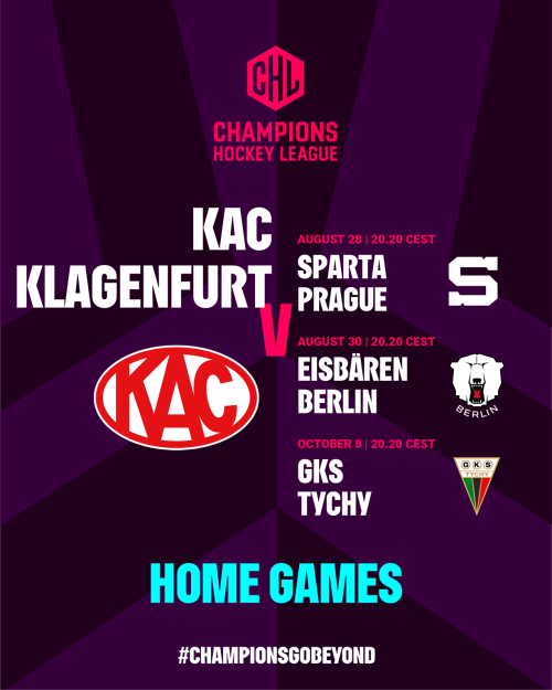 Bereits in der letzten Woche des Monats August starten die Rotjacken in die Gruppenphase der Champions Hockey League, die gleich zu Beginn zwei europäische Spitzenmannschaften nach Klagenfurt bringt: Am Donnerstag, dem 28. August, kommt Traditionsklub Sparta Prague, achtfacher Meister Tschechiens bzw. der Tschechoslowakei, in die Heidi Horten-Arena, zwei Tage später, am Samstag, dem 30. August, gastiert der amtierende deutsche Meister und DEL-Rekordchampion Eisbären Berlin am Wörthersee.