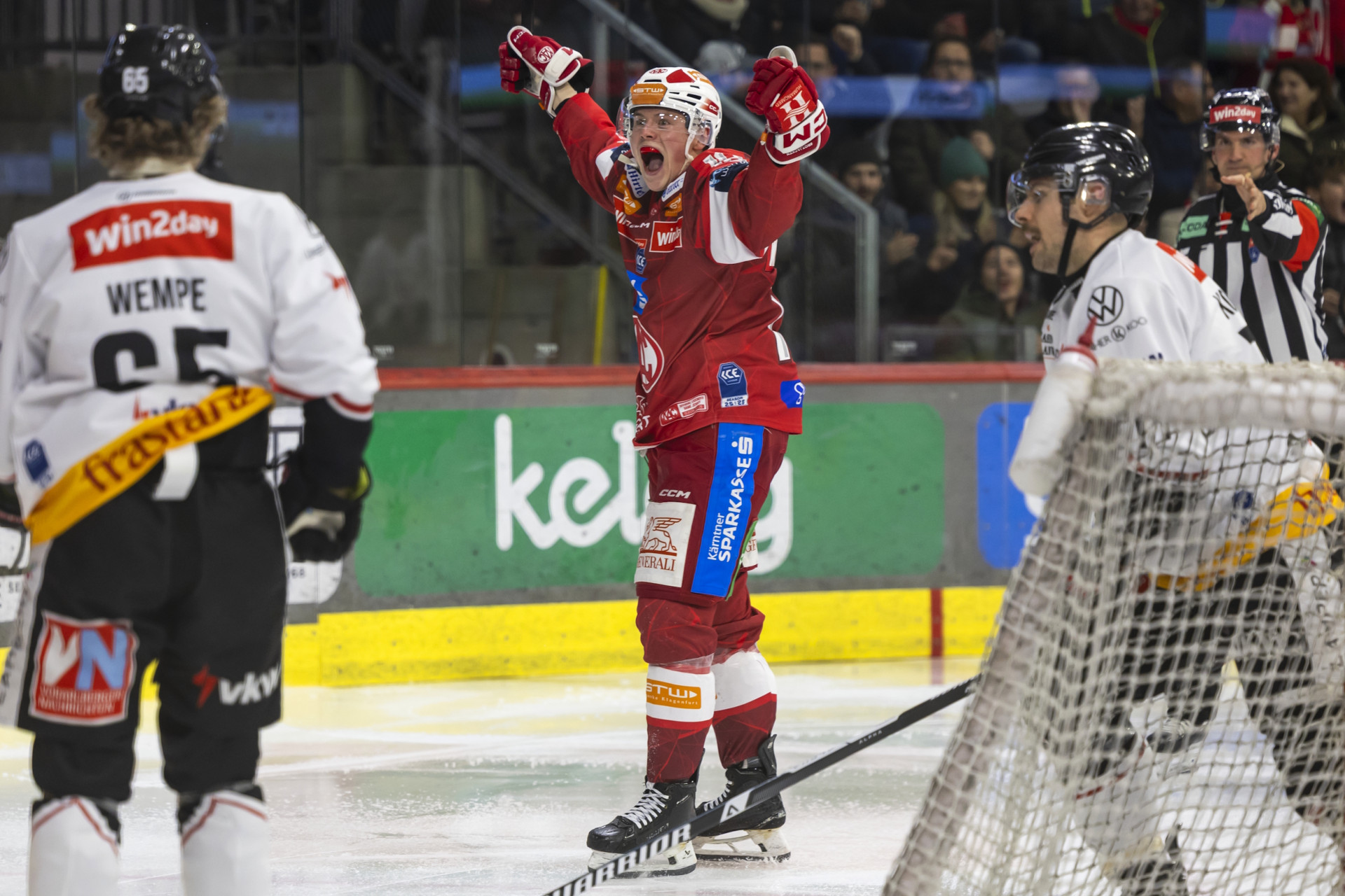 In einer gemächlichen Anfangsphase hatten die Rotjacken mehr Puckbesitz, die Pioneers aber die konkreteren Chancen: Einer Befreiung sprintete Collin Adams hinterher, er brachte vor Florian Vorauer noch einen Haken auf die Rückhand an, fand dann aber nur den Beinschoner, den der KAC-Goalie in der Grätsche ausgefahren hatte (3.). Nach einem Klagenfurter Turnover zog Kevin Macierzynski über links im Solo diagonal zum Kasten, Vorauer schloss die Beine und parierte den „Five Hole“-Versuch (9.). Dann gingen die Vorarlberger in Führung: Cole Gallant driftete nach zentralem Zoneneintritt nach halbrechts und schlenzte halbhoch in die lange Ecke (11.). Nun wurde auch der EC-KAC offensiv gefährlicher: Thomas Hundertpfund passte von der Grundlinie aus mit der Rückhand vor den Kasten, Raphael Herburger klopfte die Scheibe vom Crease aus auf Goalie Alex Caffis Körper (11.). Ganz ähnlich entstand der Ausgleichstreffer: Mario Kempe schob seinen eigenen Rebound ebenfalls von der verlängerten Torlinie aus an den Torraum, David Waschnig verwertete (12.). Auch die nächste Klagenfurter Gelegenheit mündete mit Glück in einem Torerfolg: Thomas Hundertpfund passte von der rechten Halfwall aus diagonal in den linken Rückraum, Clemens Unterweger schlenzte und vom Oberkörper von Pioneers-Verteidiger Matthias Mader aus sprang der Puck in die Maschen (14.). Eine schöne Kombination brachte die nächste rot-weiße Chance: Simeon Schwinger spielte aus der Tiefe einen Flip-Pass mit der zurück an den Torraum, Raphael Herburger übernahm aus der Luft, setzte den Puck aber zu zentral auf Caffi (17.).
