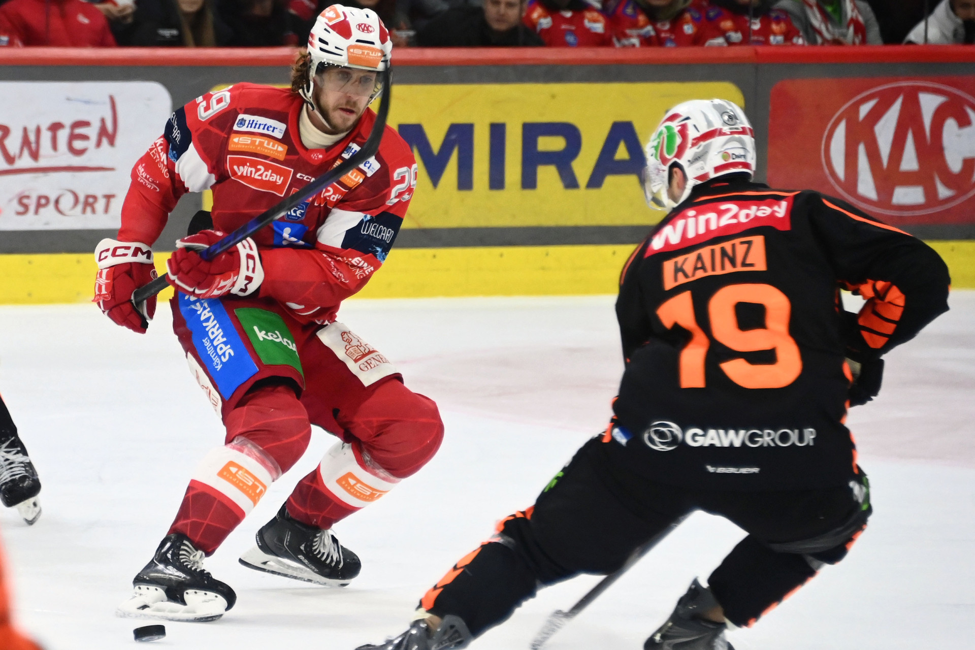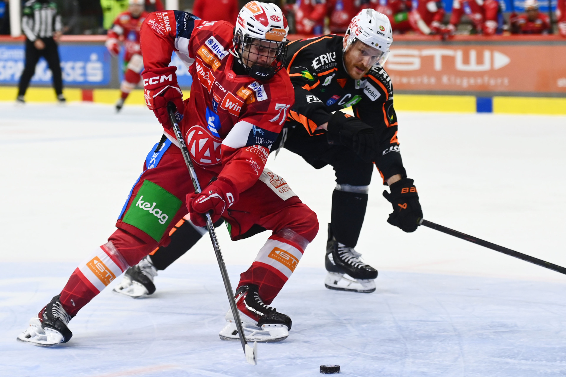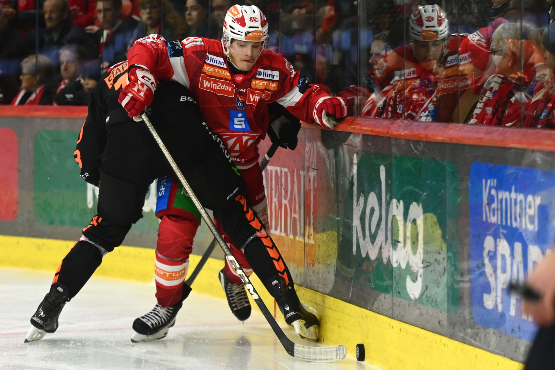 Die ohne sechs Stammkräfte angetretenen Rotjacken verloren im Startdrittel auch Thomas Hundertpfund (Unterkörperverletzung), die erste konkrete Gelegenheit der Partie hatten die Gäste aus der Steiermark: Marcus Vela kam halbrechts in der Tiefe zum Abschluss, schoss aber flach an der langen Ecke vorbei ab (3.). Bei den Klagenfurtern bediente Raphael Herburger von hinter dem Kasten aus Simeon Schwinger, der aus kurzer Distanz nur die Schulter von Maxime Lagacé fand (4.). Der Goalie machte sich auch breit, als der von Fraser aus der Rundung am Crease bediente Fabian Hochegger die Schaufel hinhielt (6.). Chris Collins scheiterte mit einem Wraparound auf die Vorhand (10.), Lukas Kainz lenkte einen Haudum-Fernschuss knapp über die Querlatte ab (13.), dann kam Graz zu seiner ersten Überzahlgelegenheit: Michael Schiechls Direktabnahme von zwischen den Hashmarks aus konnte Sebastian Dahm parieren (14.), für 25 Sekunden durften sich die 99ers sogar bei „Fünf-gegen-Drei“ versuchen, kamen dabei aber gegen kämpferische Klagenfurter zu keinem aussichtsreichen Abschluss. Im einfachen Powerplay tauchte Josh Currie auf der rechten Seite frei auf, seinen Schuss konnte Dahm an der kurzen Ecke vorbeilenken (16.). Als Anders Koch im hohen Slot nach halblinks driftete und schlenzte, flog Paul Hubers Abfälscher nur knapp über das Tor (17.). Spät im ersten Durchgang kamen auch die Rotjacken zu einem Überzahlspiel, dort passte Thimo Nickl aus der rechten Rundung diagonal zurück, Finn van Ee zog aus dem halbrechten Zentrum ab, Lagacé parierte mit dem Beinschoner (20.).